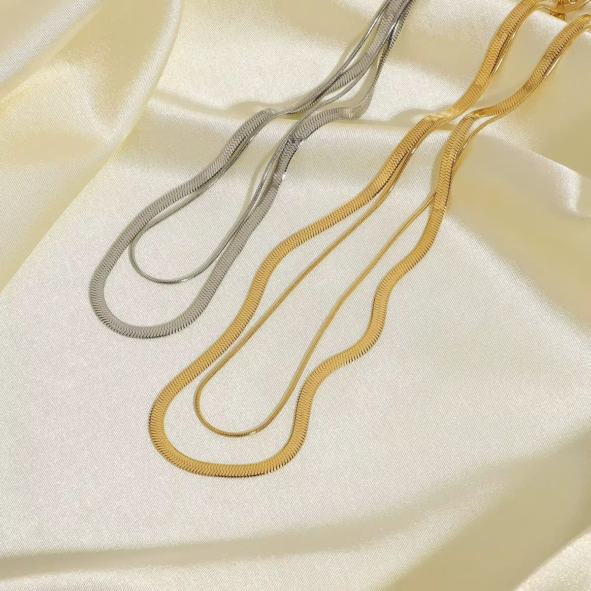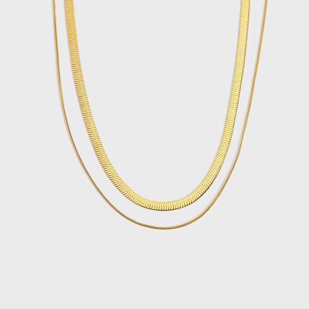 Experience the unparalleled craftsmanship and quality of our Double Layered Herringbone Chain Necklace. Meticulously crafted from high-quality materials, including durable metals and intricate detailing, this necklace is designed to withstand the test of time. Each link is carefully soldered and polished to perfection, ensuring a smooth, seamless finish that exudes luxury and refinement. Whether you're treating yourself or searching for the perfect gift for a loved one, you can trust in the superior quality and timeless beauty of this exquisite necklace. 🐍💫✨