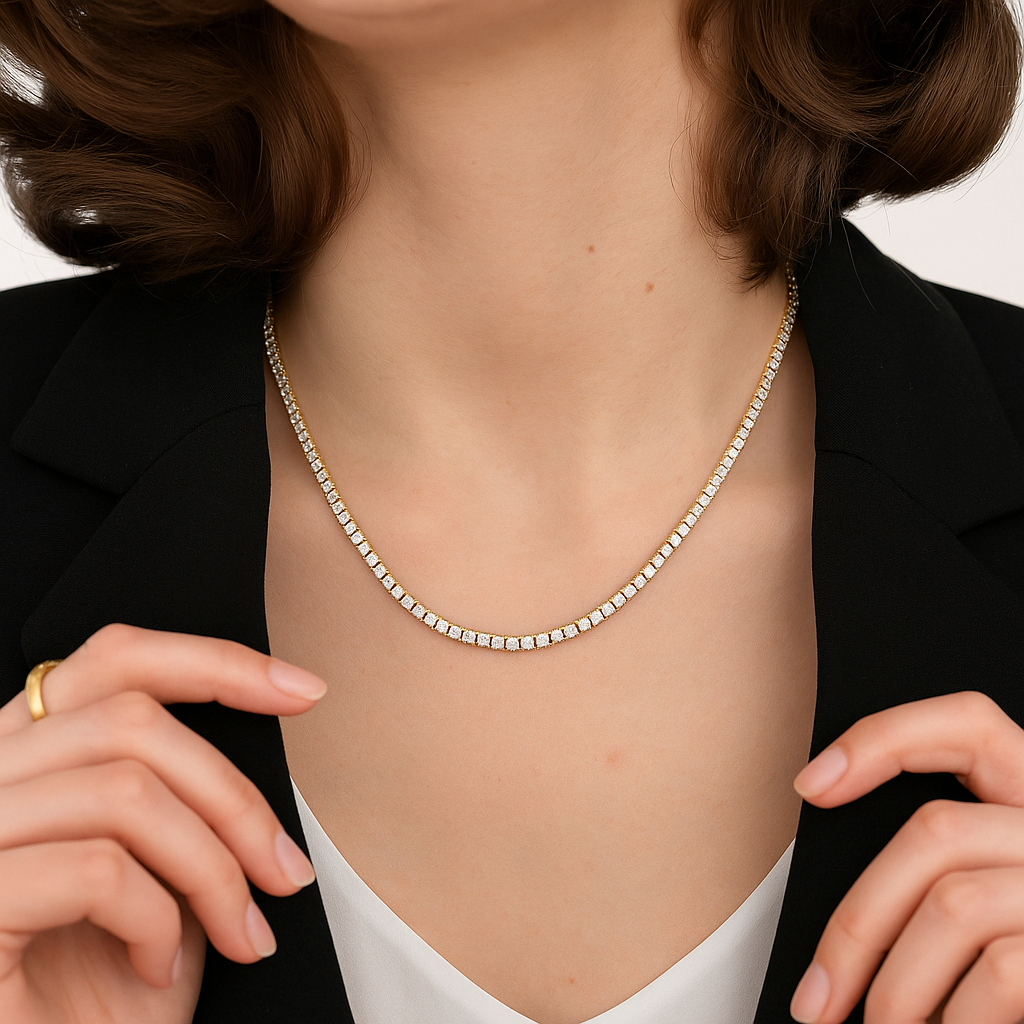 Illuminate your neckline with the mesmerizing brilliance of our CZ Cuban Chain Choker. Crafted with precision and adorned with shimmering cubic zirconia stones, this choker exudes opulence and elegance. Each link of the Cuban chain is meticulously crafted to ensure durability and comfort, making it the perfect accessory to elevate any ensemble with a touch of glamour.
