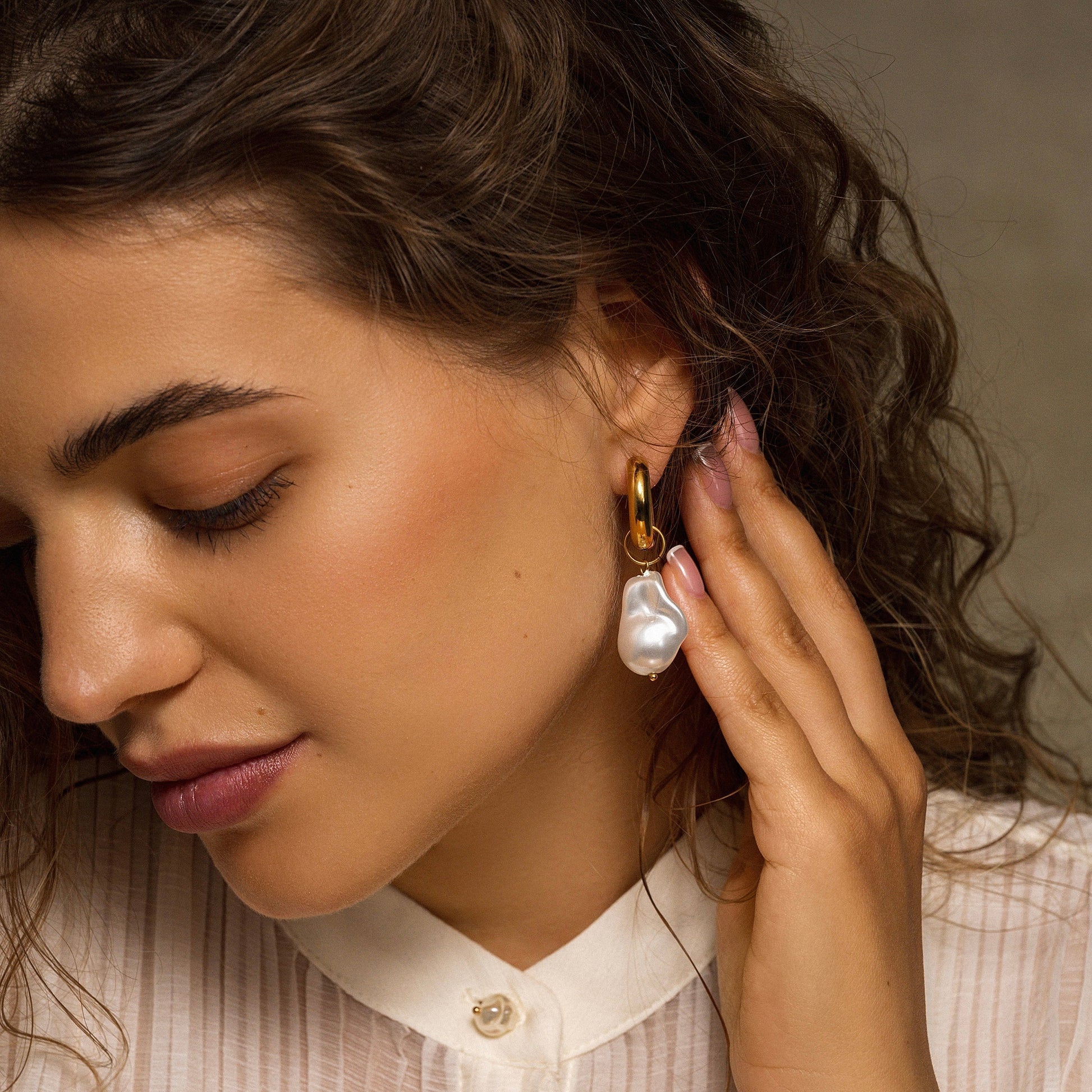 Double the Glamour: Transform your look effortlessly with our Detachable Baroque Pearl Drop Hoop Earrings.