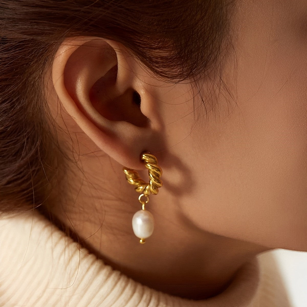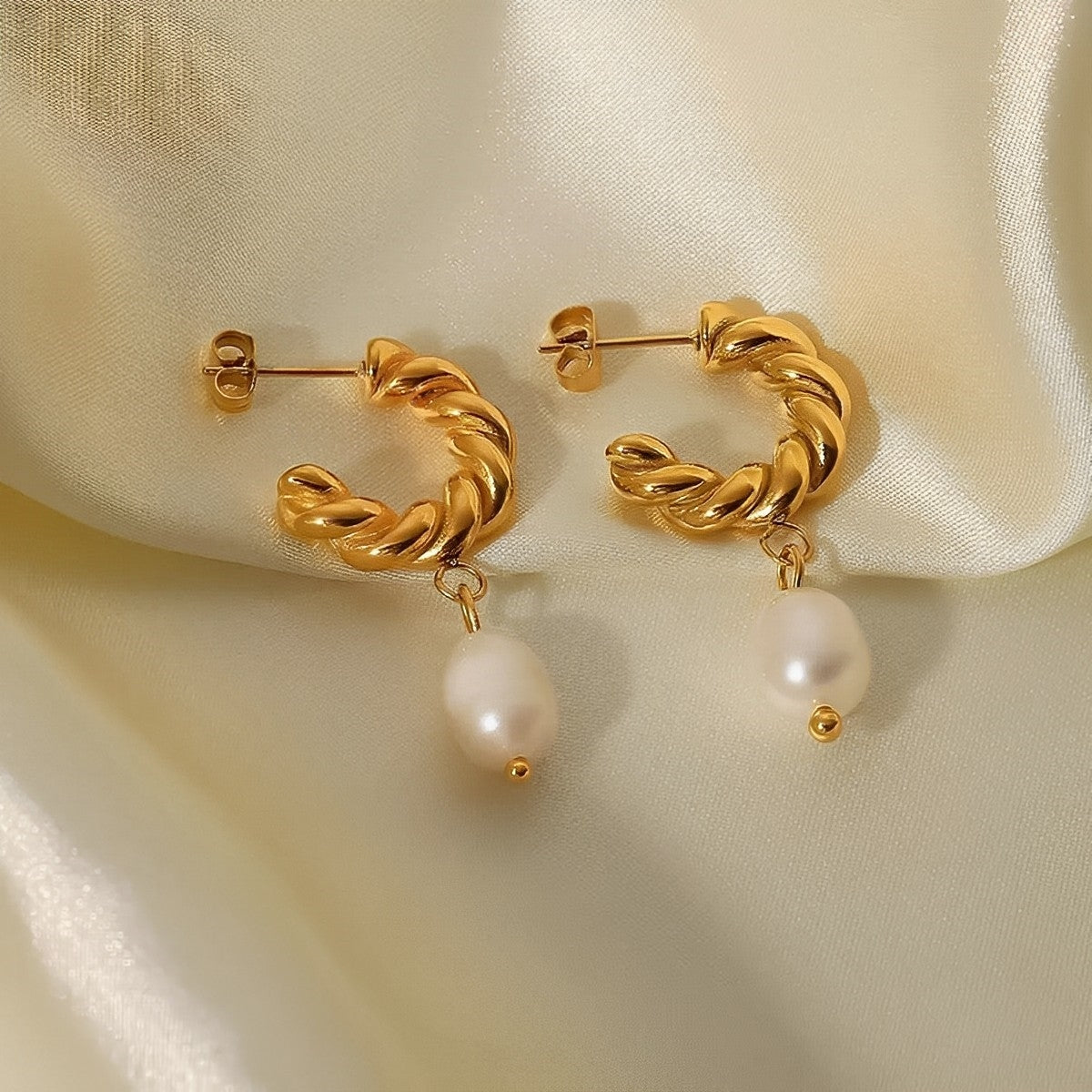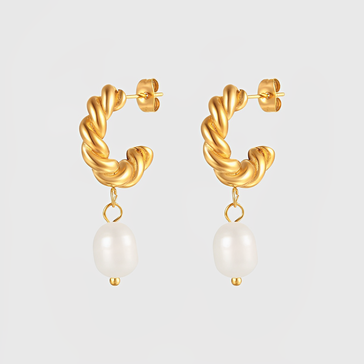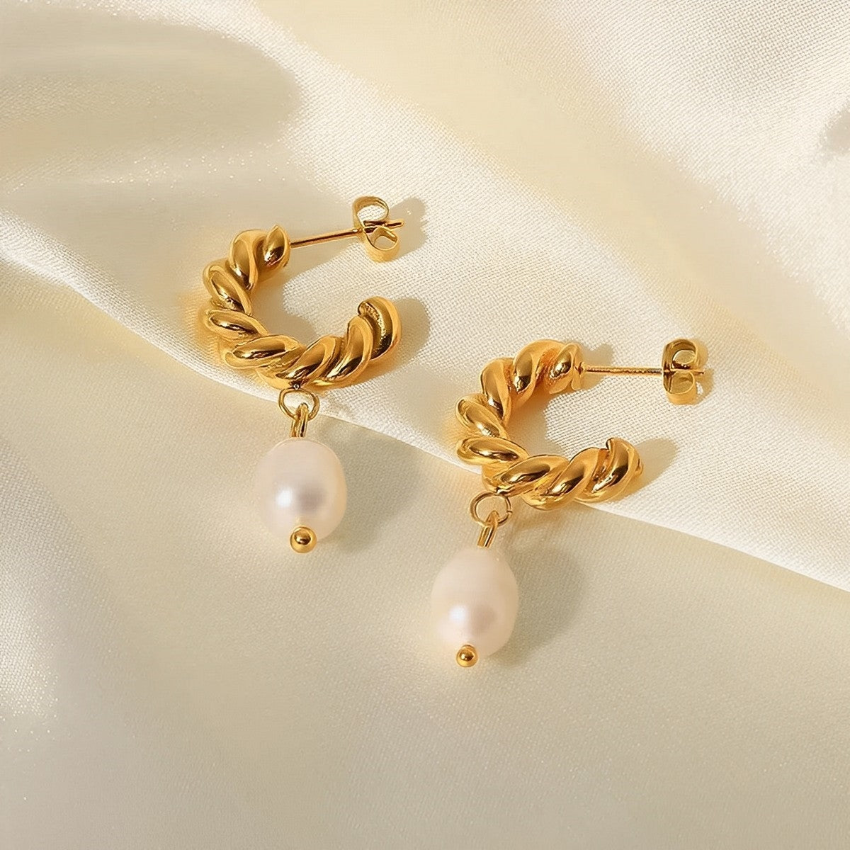 Twisted French Hoop Earrings with Pearl Drops showcase a harmonious blend of sophistication and playfulness, intertwining the charm of twisted hoops with the timeless elegance of dangling pearls.